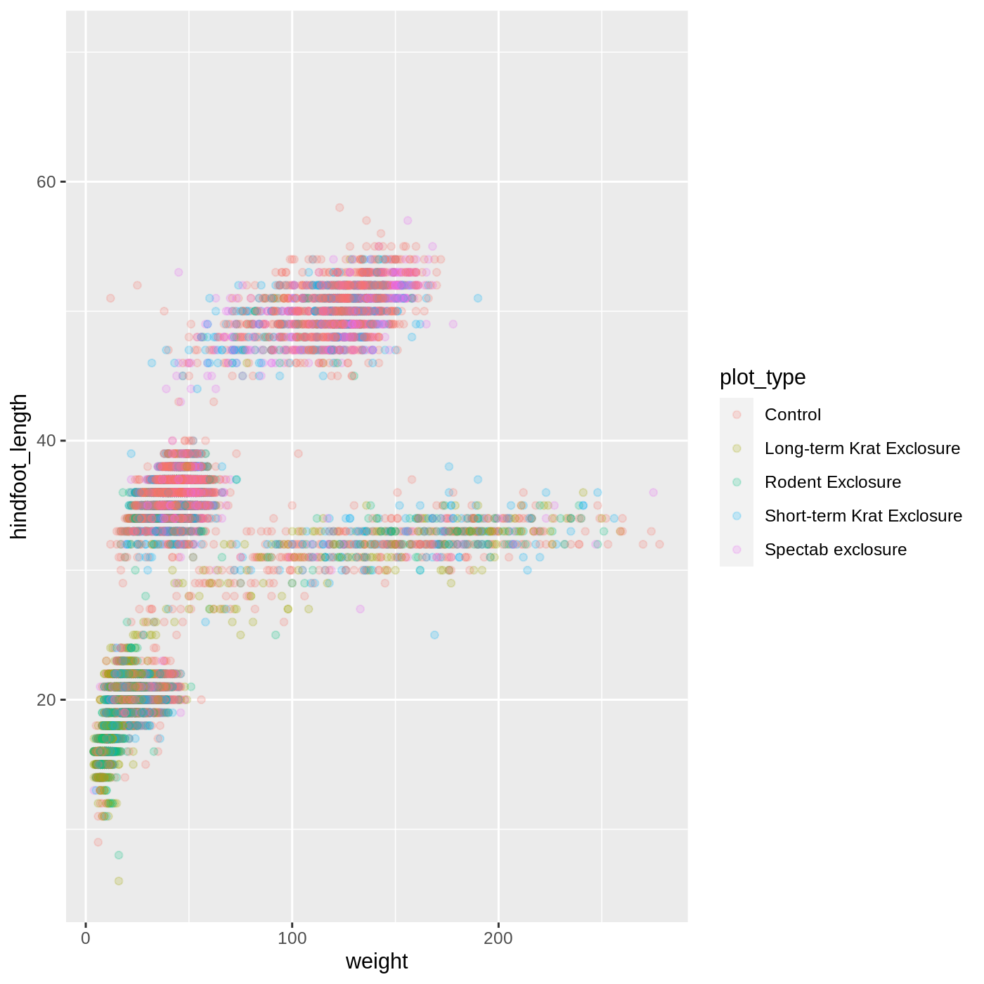 You may notice a warning that missing values were removed. If a variable necessary to make the plot is missing from a given row of data (in this case, hindfoot_length or weight), it can’t be plotted. ggplot2 just uses a warning message to let us know that some rows couldn’t be plotted.